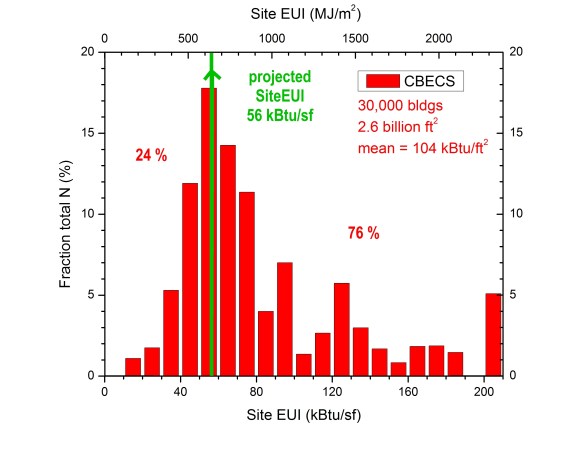Had the Hotel achieved this projected target energy, however, it would not be an impressive accomplishment.  This target site EUI is still higher than that of 25% of the estimated 30,000 U.S. Hotels  We know about energy use by U.S. Hotels from the 2012 Commercial Building Energy Consumption Survey (CBECS).  The graph below shows the SiteEUI distribution for U.S. Hotels as determined from this survey.  It is clear that the projected site EUI use for the Hotel at Oberlin is lower than 75% of these hotels.  A similar statement can be made about the projected source EUI for the hotel.