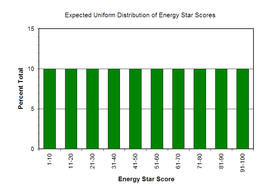 In 1999 the EPA first introduced its Energy Star building score for office buildings, the most common building type. The score is a number ranging from 1-100 that is intended to represent a particular building’s percentile ranking with respect to energy consumption as compared with similar buildings nationally. So, if your building receives a score of 75 that is supposed to mean that, if you were to look at all similar buildings across the country, your building uses less energy than 75% of them, adjusting for indicated operating conditions. Office buildings are the most common type of building. Presumably if it were possible to determine the Energy Star score for every office building in the country you would find that half of them have scores ranging from 1-50 and the rest from 51-100. Similarly you expect 10% of office buildings to have scores ranging from 91-100 and another 10% would have scores from 1-10, etc. In general, you would expect a histogram of Energy Star scores for all office buildings to look like this.