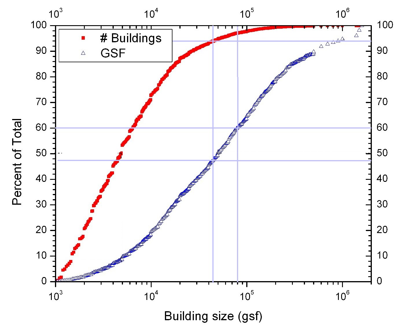 This histogram represents Energy Star scores from an estimated 314,000 buildings occupying a total of 9.7 billion gsf! The average ES for the 314,000 buildings is 62. The graph clearly shows that the scores are not uniformly distributed and, instead, there is an overabundance of scores higher than 50. A salute to lake Wobegon!