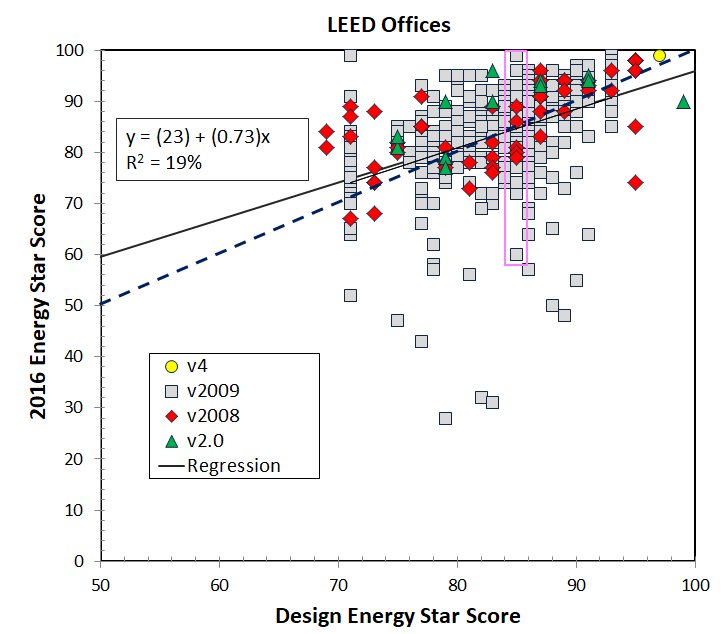 What we see is that only 19% of the variation in 2016 Energy Star scores is “explained” by the score submitted at time of certification.  81% of the variations in 2016 Scores is unrelated to this initial score.  The pink rectangle shows the range of 2016 Energy Star scores for offices that earned a score of 85 at time of certification.  There are 35 such buildings, and their 2016 Energy Star scores range from 60 to 99.  You see similar variation everywhere along the curve.  In the most outrageous cases a building’s Energy Star score in 2016 was 52 points lower than what was reported when it was LEED certified!