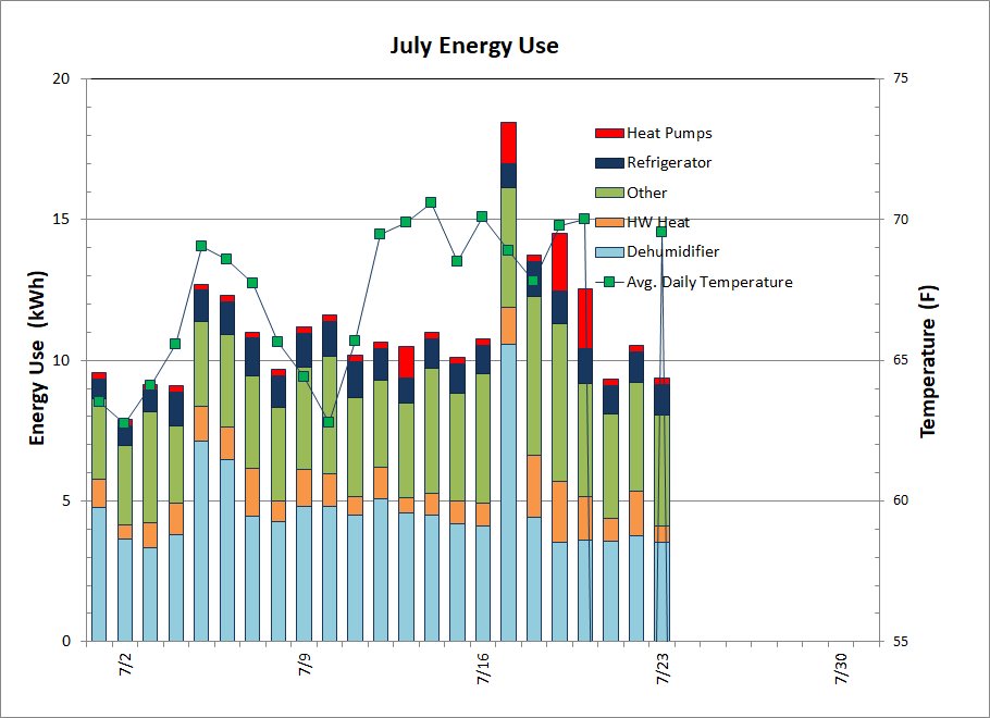 While I have electric bills from previous years, it would not be useful to compare them with my more recent bills. Everything in the house is electric — hot water heater, stove, clothes dryer, etc. — so with three people now living in this house full time the energy use is too different from what it was in previous years when we only summered here.
